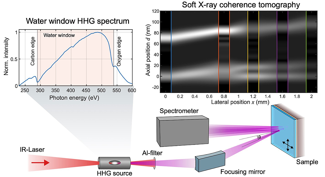 Ein Forschungsteam aus Jena, Berlin und Mittweida unter Beteiligung von Prof. Silvio Fuchs vom Laserinstitut Hochschule Mittweida hat einen bedeutenden Fortschritt in der laborbasierten Soft-Röntgenbildgebung erreicht. Die Ergebnisse wurden unter dem Titel "Soft X-ray imaging with coherence tomography in the water window spectral range using high-harmonic generation" im renommierten Nature-Journal Light: Science & Applications veröffentlicht (Link). Erstmals wurde Soft X-ray Coherence Tomography (SXCT) mit hohen Harmonischen (High-Harmonic Generation, HHG) im sogenannten Wasserfenster (Wellenlänge 2,3 - 4,4 nm) demonstriert. Die Methode ermöglicht zerstörungsfreie Tiefenprofil-Bildgebung in Nanostrukturen mit einer axialen Auflösung von 12 nm.