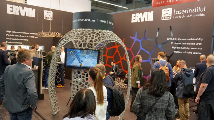 Auf einem Gemeinschaftsstand mit Ervin Germany GmbH stellte das Laserinstitut Hochschule Mittweida (LHM) vom 18. bis 21. November 2025 erstmalig auf der Formnext aus und präsentierte seine neueste Entwicklung: LPBF-XXL. Der Besuchermagnet am Messestand war ein mit unserem neuen Verfahren in nur 190 Stunden gefertigter 2,5 m hoher und 450 kg schwerer Pavillon aus Edelstahl mit einem Durchmesser von 2,1 m. Das damit größte pulverbettbasiert gefertigte Metallbauteil auf der Messe sorgte für einen riesigen Andrang und machte die Messeteilnahme zu einem vollen Erfolg.