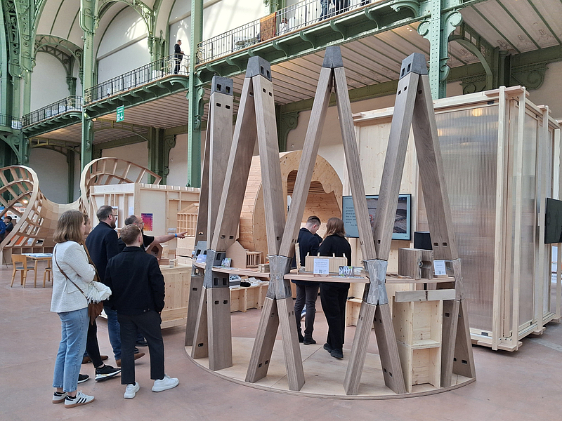 Um den Entwurf bereits jetzt erlebbar zu machen, wurde für die Ausstellung des 15e Forum International Bois Construction (25. - 27.02.2026), dem Internationalen Holzbau-Forum im prestigeträchtigen Grand Palais in Paris, ein 3,5 Meter hoher, begehbarer Turmausschnitt im Maßstab 1:2 gefertigt. Dieser Ausschnitt zeigt die Turmspitze, also den raumprägendsten Teil des Bauwerks, und vermittelt eindrucksvoll das räumliche Erlebnis, als befände man sich bereits im realen Turm.
