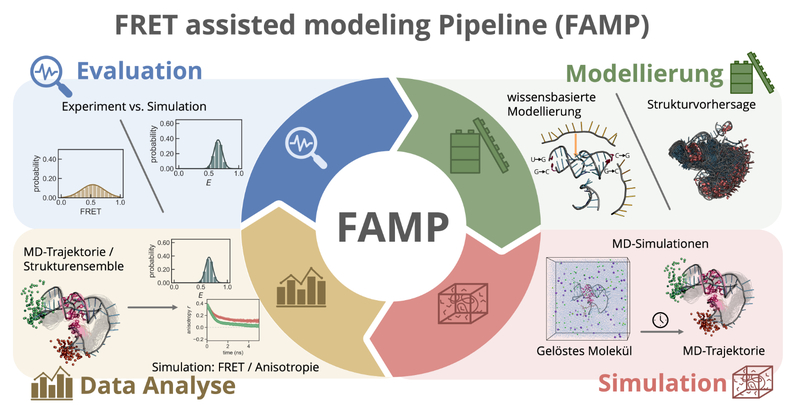 Ein besonderer Fortschritt ist die neu entwickelte FRET-gestützte Selektion von RNA-Strukturen. Sie ermöglicht es, große Mengen in silico erzeugter Strukturmodelle automatisiert zu filtern und gezielt jene auszuwählen, die experimentelle FRET-Verteilungen am besten abbilden. Hier geht es zur Veröffentlichung: https://doi.org/10.1093/nar/gkag147
