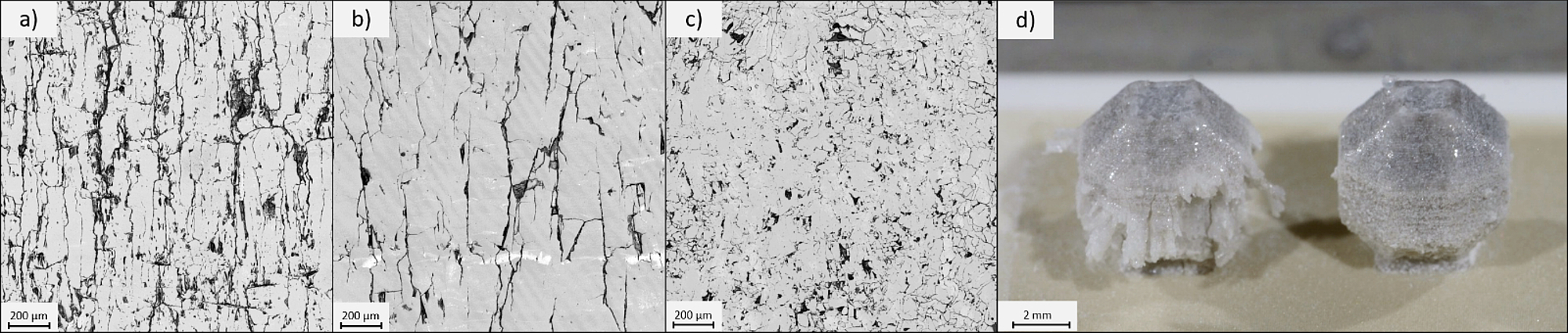 Im Rahmen des Teilprojekts wurde eine neue Forschungsanlage für den keramischen 3D-Druck aufgebaut und in Betrieb genommen. Die Anlage dient als flexible Plattform für material- und prozessbezogene Untersuchungen im Bereich des selektiven Laserstrahlschmelzens (SLM) keramischer Werkstoffe. Ein wesentlicher Schwerpunkt der Arbeiten lag auf der Prozessentwicklung für Aluminiumoxid (Al2O3) unter Verwendung von CO2-Laserstrahlung. Durch stetige Optimierung der relevanten Prozessparameter sowie durch den Einsatz angepasster Scanstrategien konnte die relative Bauteildichte schrittweise von anfänglich etwa 60 % auf bis zu 85 % erhöht werden. Zusätzlich wurden Outlineparameter entwickelt, die zu einer deutlichen Reduktion von Spannungsrissen in Randbereichen von Bauteilen führten und die Fertigung von stützfreien Überhängen bis 45 ° ermöglichten. Trotz dieser Fortschritte stellte die Rissbildung eine zentrale Herausforderung dar. Durch gezielte Rissanalyse sowie Anpassungen der Prozessparameter und Scanstrategien konnte die Rissbildung zwar reduziert, jedoch nicht vollständig vermieden werden. Zusätzlich wurden alternative Materialsysteme untersucht. Aus einem Stoffgemisch aus Al2O3 und SiO2 konnten nach entsprechender Pulveraufbereitung und Parameteroptimierung Volumenkörper mit relativen Dichten von bis zu 91 % hergestellt werden. Darüber hinaus wurden erste Untersuchungen zur Verarbeitung von Zirkonoxid (ZrO2) durchgeführt. Es konnten geeignete Prozessparameter identifiziert und erste komplexe Demonstratoren erfolgreich gefertigt werden. Die bislang erreichten relativen Bauteildichten liegen bei bis zu 90,5 %.